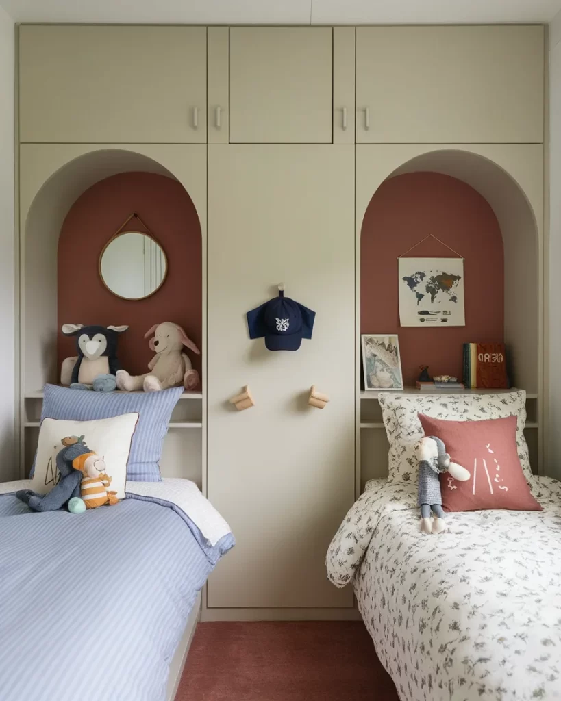 Designed with smart space utilization in mind, this divided kids’ bedroom features two arched alcoves carved into a shared wardrobe. Each bed is nestled into its own cozy niche with warm terracotta backdrops, playful pillows, and personal touches like framed prints and mirrors. Wall-mounted hooks and a central wardrobe maximize function without clutter. It’s a brilliant layout for homes with limited square footage, providing clear division while maintaining a cohesive, calming aesthetic that nurtures both comfort and independence.