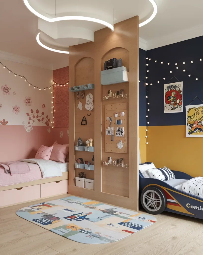 Step into a room that brilliantly balances individuality and fun. This divided space features a vibrant car bed on one side with bold navy and yellow walls, while the opposite corner boasts a soft pink nook complete with floral wallpaper and twinkling fairy lights. The central wooden partition doubles as a pegboard and storage solution, letting you organize essentials in style. It’s a fantastic way to maintain harmony between siblings with differing tastes. The contrasting color palette, layered lighting, and clever use of vertical storage make this room both visually stimulating and practical for everyday life.