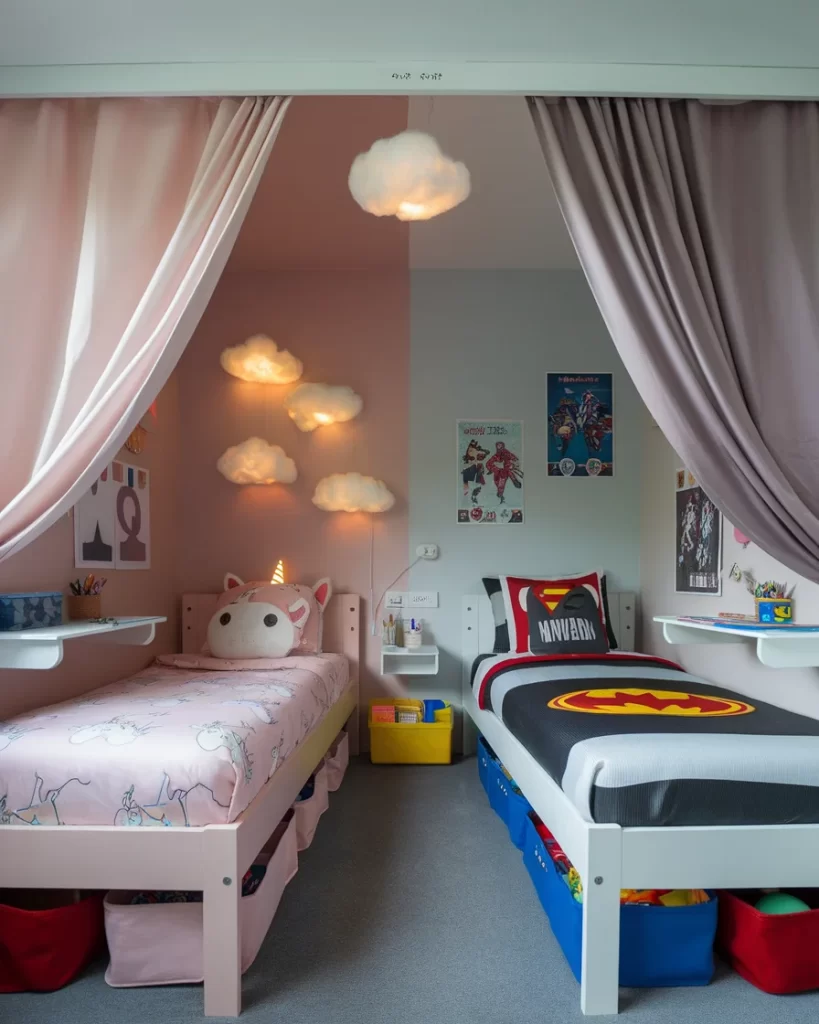 This charming kids’ room blends whimsy with personality by using curtains and contrasting decor to define each side. One bed flaunts superhero-themed bedding with graphic posters, while the other leans into pastel pinks, unicorns, and plush clouds glowing on the wall. The soft carpeting adds warmth underfoot and storage bins under the beds keep toys organized. You’ll love how the space feels cozy yet clearly separated, giving each child their own world to dream, play, and grow in. This setup is especially useful when siblings have different interests and bedtime routines.