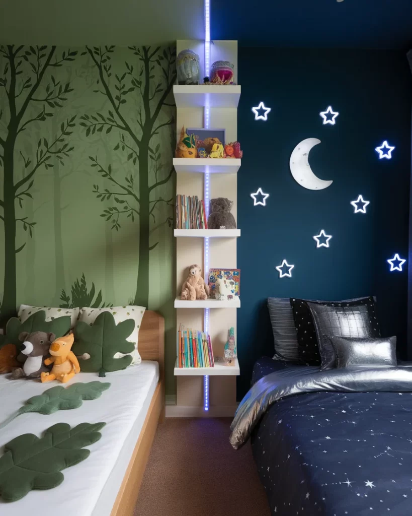Forest and Galaxy Themed Kids Room with Shelf Divider