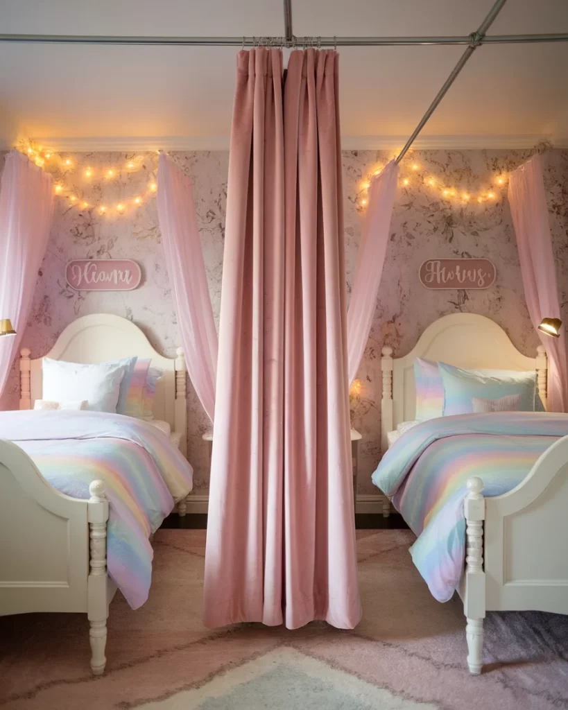 Soft and magical, this room uses a dusty rose curtain to create privacy between twin beds styled in pastel rainbow bedding. Wall mounted name signs and fairy string lights add personality and sparkle. Both sides of the room feature canopy-style drapes that give each child their own princess feel without closing off the space. A plush rug ties everything together beneath their beds. This design shows how shared rooms can still feel special and unique for each child. It’s great for siblings who love soft colors, gentle light, and cozy vibes.