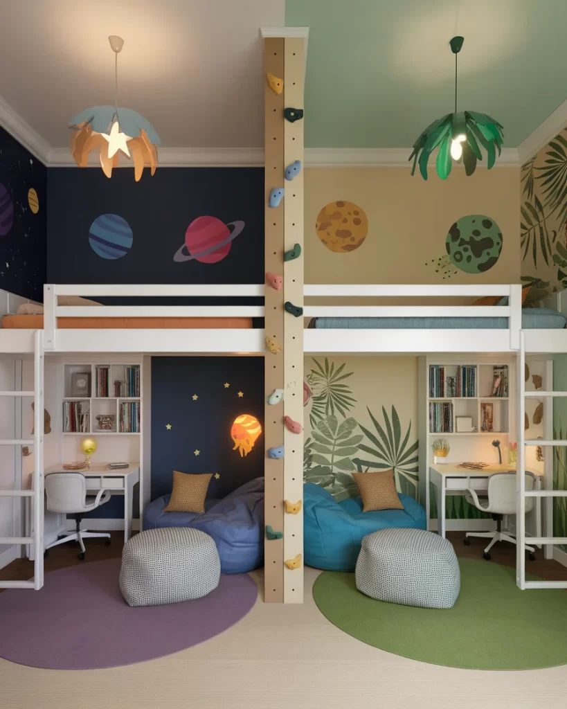 Encourage imagination and play with this smartly divided kids room featuring loft beds on either side of a central climbing wall. One side showcases a space theme with planets and stars, while the other dives into the jungle with leafy murals. Underneath the lofts, cozy study zones and beanbag reading corners invite quiet time. Round rugs help define each zone and add a layer of comfort. It’s a wonderful way to support different interests while keeping siblings close. This design uses vertical space effectively and works great for active kids in small to medium sized rooms.