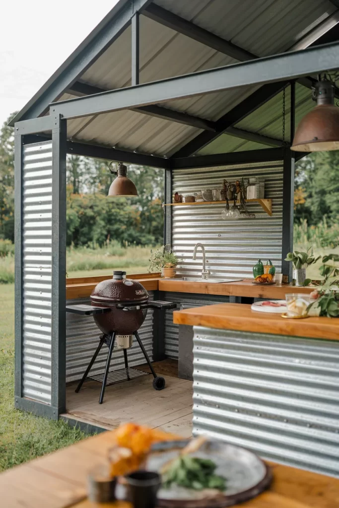 Materials Needed: Steel frame, corrugated metal sheets, butcher block counters, ceramic grill