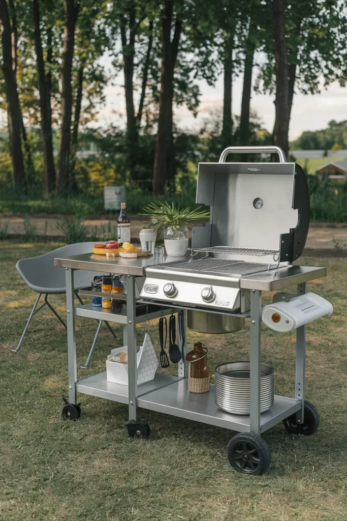 Materials Needed: Stainless steel cart, portable grill, outdoor storage baskets