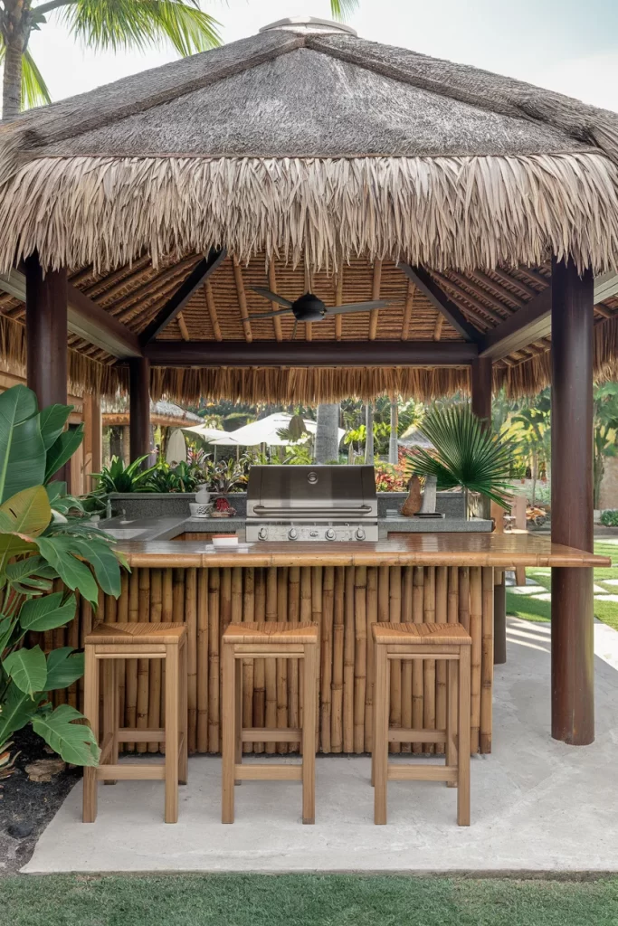 Materials Needed: Bamboo poles, palm thatch roofing, teak countertops, tiki bar stools