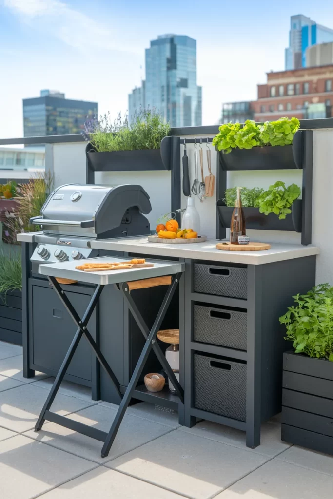 Materials Needed: Modular outdoor kitchen system, planters, compact appliances