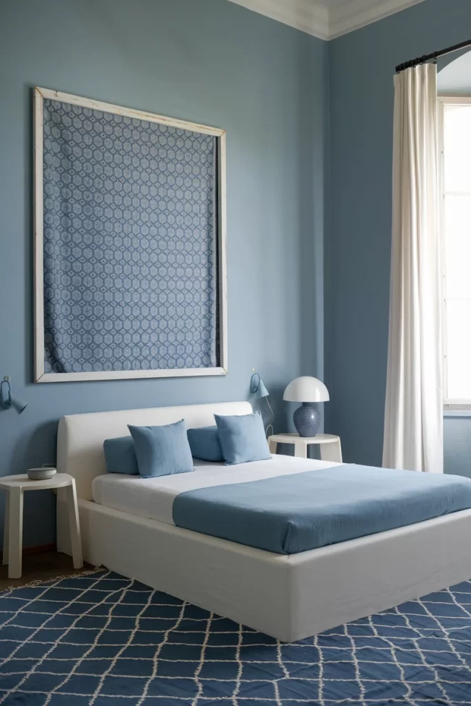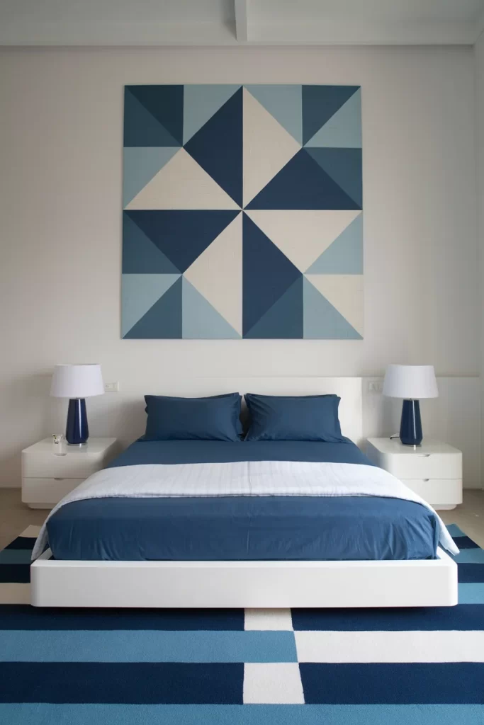 This bedroom embraces geometric design with a large-scale wall art piece featuring triangular patterns in various shades of blue and white. The low-profile white platform bed sits atop a color-blocked area rug that mirrors the wall art’s geometric theme. The monochromatic palette creates visual cohesion while the patterns add dynamic interest.