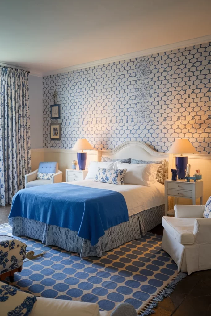 The final bedroom demonstrates confident pattern mixing with geometric blue and white wallpaper as the focal point. The room combines the patterned wallpaper with a coordinating blue area rug featuring a different geometric design. White furniture and blue bedding create balance, while warm lighting adds coziness to the pattern-rich environment.