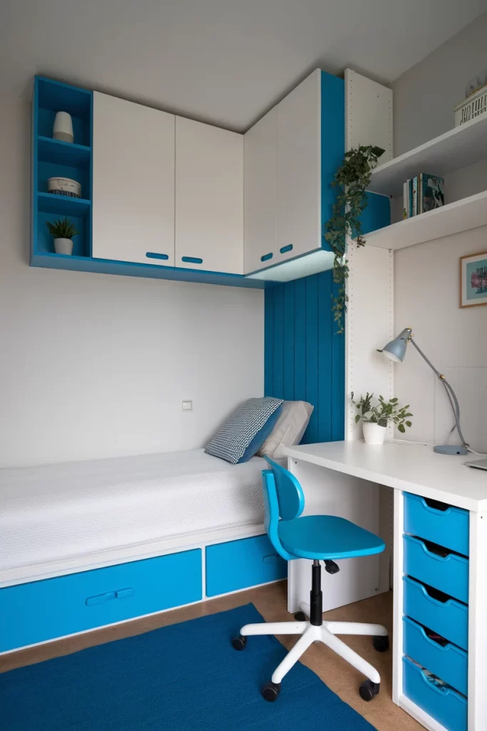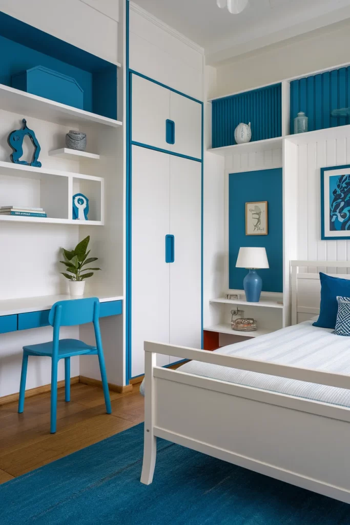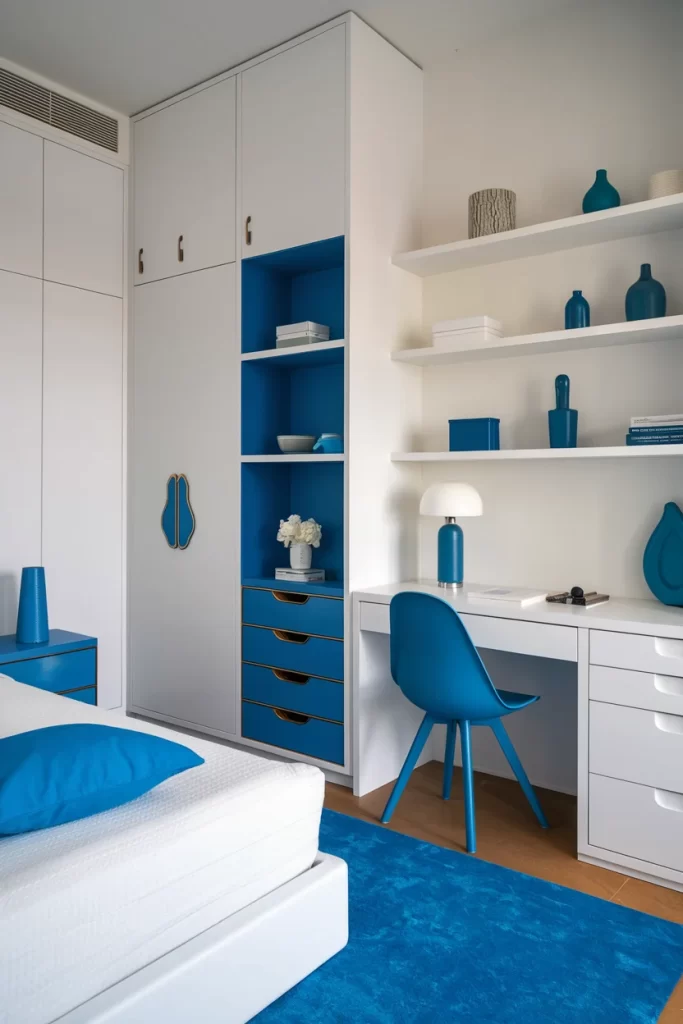 This contemporary bedroom showcases sleek white built-in storage with blue accent drawers and interior shelving. The blue desk chair matches the color scheme, while white floating shelves display blue decorative objects. The design emphasizes clean lines and efficient storage solutions.