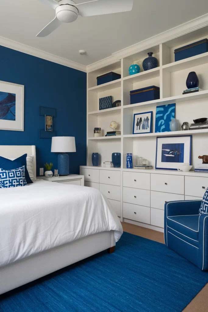 This sophisticated bedroom showcases a rich navy blue accent wall paired with crisp white bedding. The built-in shelving unit spans the entire wall, featuring a combination of open shelving and closed storage with white cabinetry and navy blue storage boxes. A comfortable navy blue armchair creates a cozy reading nook, while the blue area rug anchors the space. The ceiling fan and clean white trim provide classic architectural details.