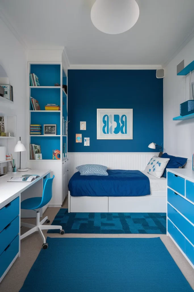This smaller bedroom maximizes space with built-in storage and a study area. The navy blue accent wall provides a bold backdrop for white built-in shelving filled with books and blue storage containers. A white platform bed with storage drawers underneath efficiently uses floor space, while a blue desk chair and coordinating rug complete the cohesive color scheme.