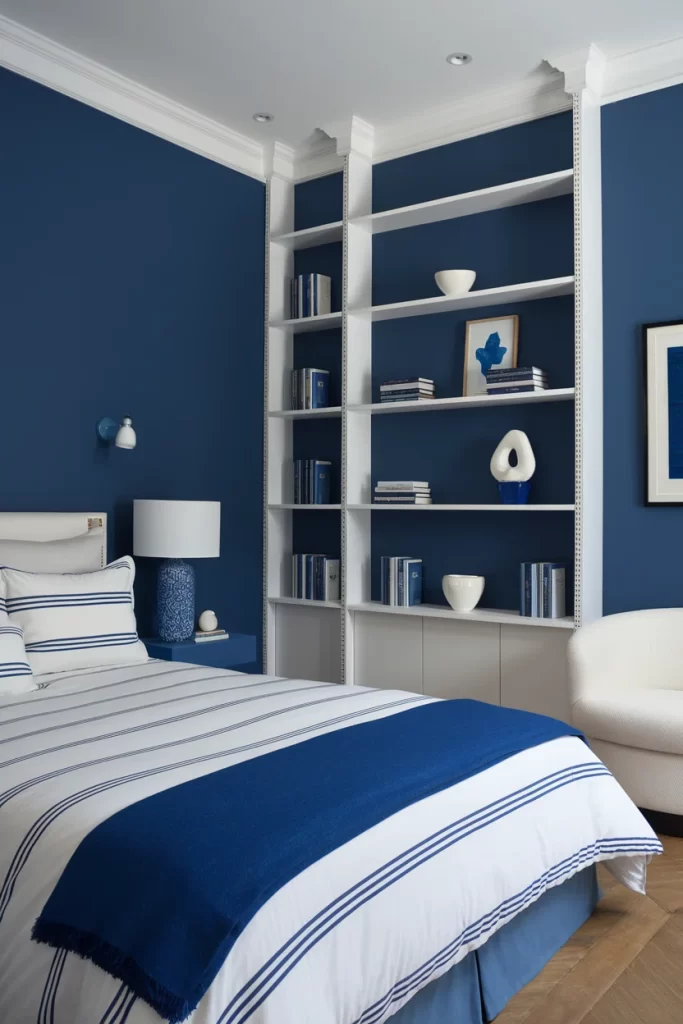 The final image shows a modern approach with floor-to-ceiling built-in shelving against navy walls. The white shelving system provides both storage and display opportunities, while the striped bedding ties together the room’s blue and white palette. The clean lines and integrated storage make this design both beautiful and highly functional.