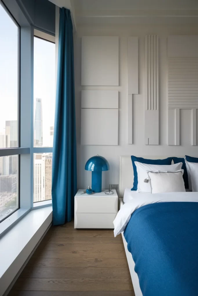 A sleek modern bedroom demonstrates how blue accents can work in urban settings. The space includes floor-to-ceiling windows, navy curtains, and a striking blue mushroom-style table lamp. White floating nightstands and clean-lined furniture maintain the minimalist aesthetic, while the city skyline provides a dramatic backdrop through the expansive windows.