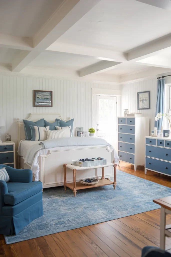 This bedroom embraces a relaxed cottage aesthetic with white vertical shiplap walls that create texture and visual interest. The exposed white ceiling beams add rustic charm while maintaining the airy feel. The white bed frame is dressed in soft blue pillows and throws, creating a serene sleeping environment. A standout feature is the blue and white chest of drawers that combines both colors in alternating drawers. The blue area rug anchors the seating area, which includes a cozy blue armchair perfect for reading.
