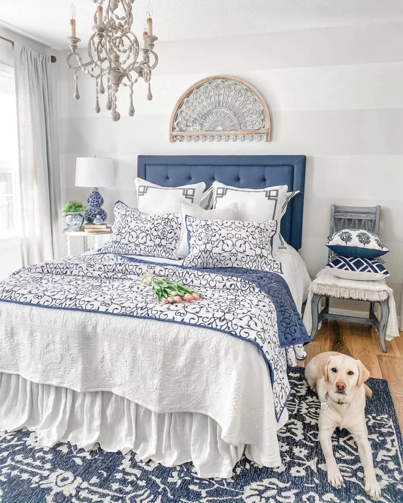 This sophisticated bedroom demonstrates how to masterfully mix blue and white patterns. A navy tufted headboard creates a bold backdrop for intricate blue and white scrollwork bedding. The ornate chandelier adds glamour, while the decorative carved wall medallion provides architectural interest. A vintage-style chair with coordinating pillows creates a cozy reading nook, proving that pattern mixing can be both elegant and harmonious.