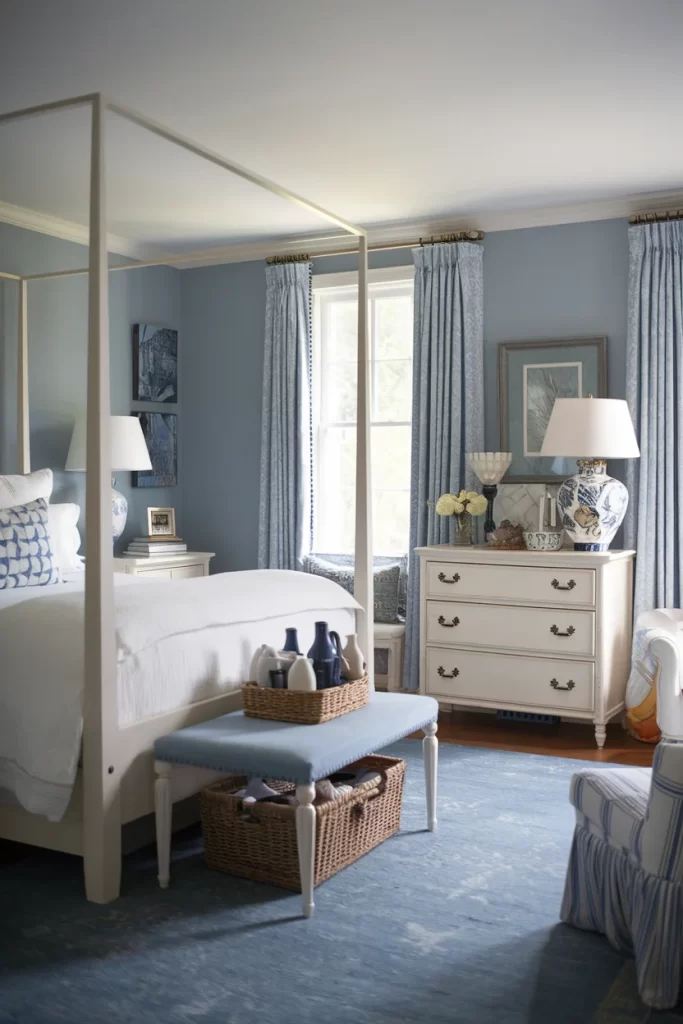 This sophisticated bedroom showcases a white four-poster bed against soft blue walls. The room includes traditional elements like a white chest of drawers with brass hardware, blue bench at the foot of the bed, and patterned curtains. The blue area rug grounds the space while maintaining the refined, classic aesthetic.