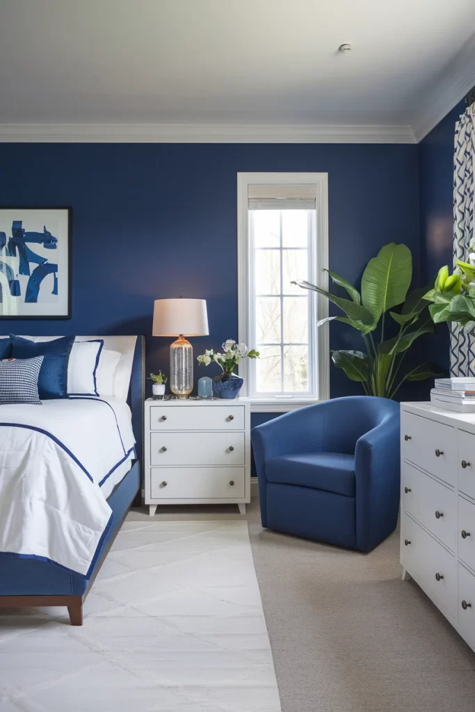 This bedroom features deep navy blue walls that create a dramatic backdrop for the white upholstered bed. A white nightstand sits between the bed and window, topped with a crystal table lamp. The navy blue accent chair provides additional seating, while a large potted plant adds a natural element. The window treatments and bedding maintain the blue and white color scheme throughout.