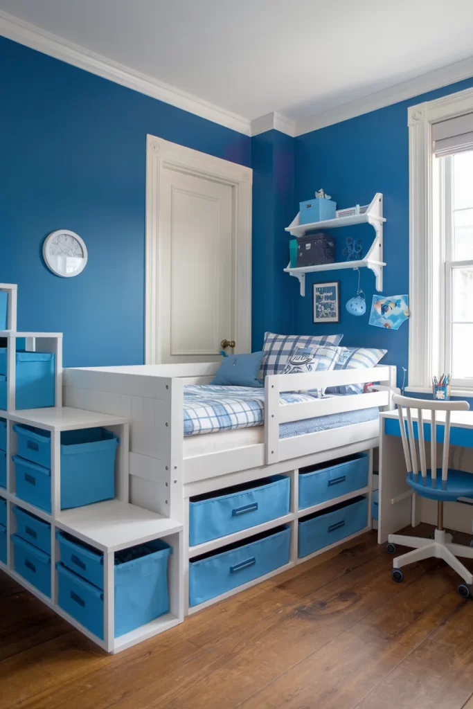 This practical children’s room maximizes space with a raised bed platform over built-in storage drawers in coordinating blue. The bright blue walls are balanced by white furniture and natural wood flooring, while the integrated desk area provides a dedicated study space.