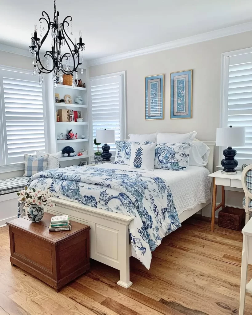 A timeless approach to blue and white decorating, this bedroom features classic chinoiserie-inspired bedding with pagodas and Asian motifs. The white painted bed frame keeps the look crisp, while built-in shelving provides both storage and display space for decorative objects. The black chandelier adds drama, and plantation shutters control natural light while maintaining the classic aesthetic.