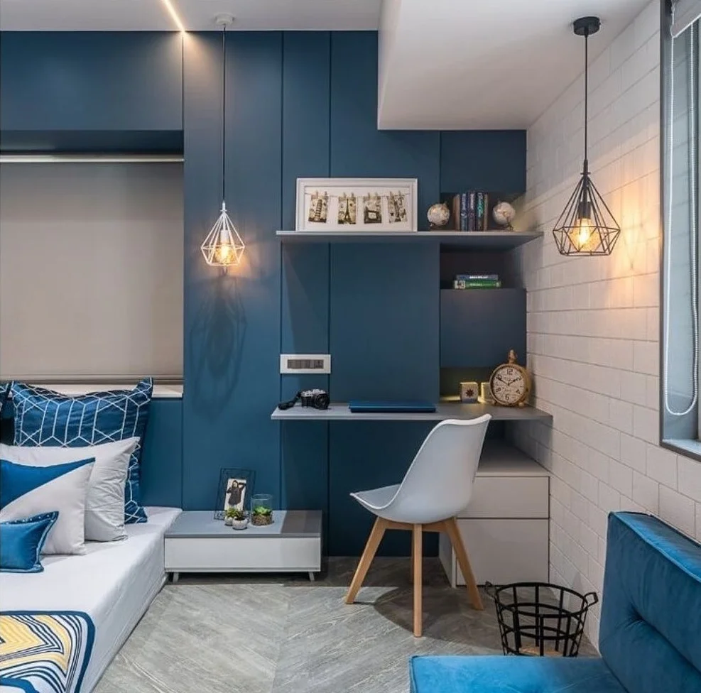This contemporary bedroom maximizes space with a stunning built-in storage wall in deep blue. The integrated desk area with geometric pendant lights creates a functional workspace, while white bedding keeps the look fresh and modern. The clean lines and smart storage solutions make this perfect for smaller spaces or anyone who appreciates organized, streamlined design.