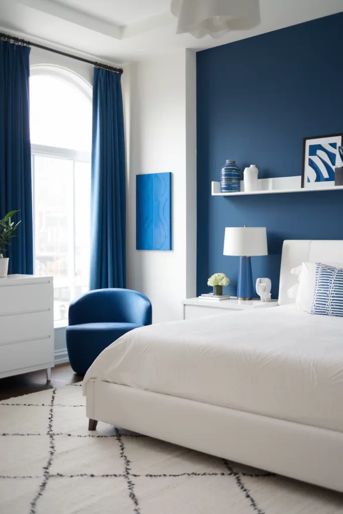 This sophisticated bedroom showcases a deep navy accent wall paired with crisp white furniture. The room features a curved navy accent chair, white platform bed, and floating shelves displaying ceramics and artwork. The geometric area rug with diamond patterns in cream and navy ties the color scheme together, while natural light from the arched window creates a bright, airy atmosphere.