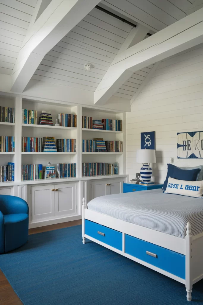 A charming bedroom featuring white shiplap walls, exposed ceiling beams, and extensive built-in bookshelving painted in crisp white. The blue accents come through in the bedding, chair upholstery, and decorative accessories, creating a library-like atmosphere perfect for reading enthusiasts.