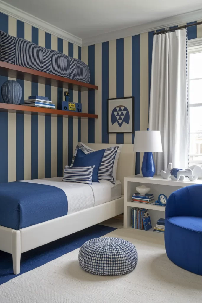 This child’s bedroom embraces pattern with bold blue and white vertical stripes covering the walls. The design includes custom bunk beds with integrated storage, striped bedding, and nautical-themed accessories. The room demonstrates how bold patterns can work effectively in smaller spaces when balanced with solid-colored furnishings.