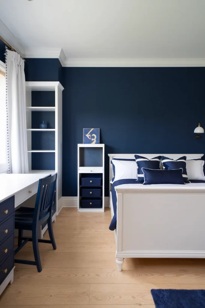 A bold approach using deep navy walls as the dominant color, balanced by white furniture and trim work. The room includes built-in storage solutions with blue accent drawers and coordinating textiles. The contrast between the dark walls and light furnishings creates a sophisticated, cocoon-like atmosphere.
