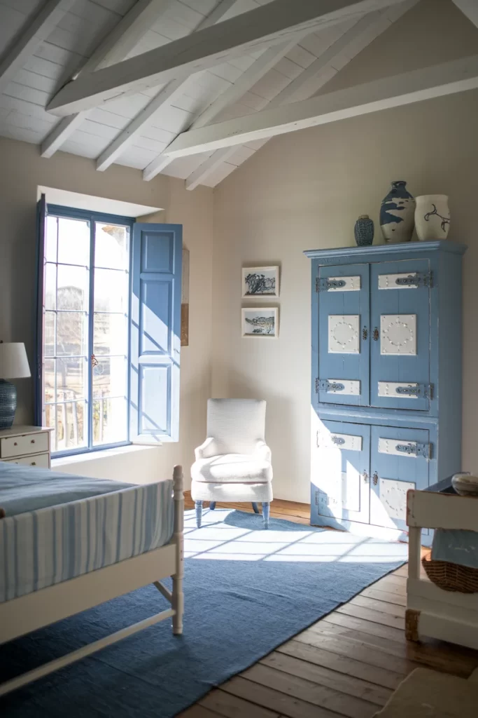 This bedroom combines rustic and Mediterranean influences with dramatic exposed white ceiling beams creating an architectural canopy effect. The blue French doors and window shutters add European charm while flooding the space with natural light. A beautiful blue armoire serves as both storage and a statement piece, topped with decorative pottery. The neutral wall color allows the blue elements to pop, while a blue geometric area rug adds pattern and defines the seating area. The simple white chair and natural textures complete this serene, European-inspired retreat.