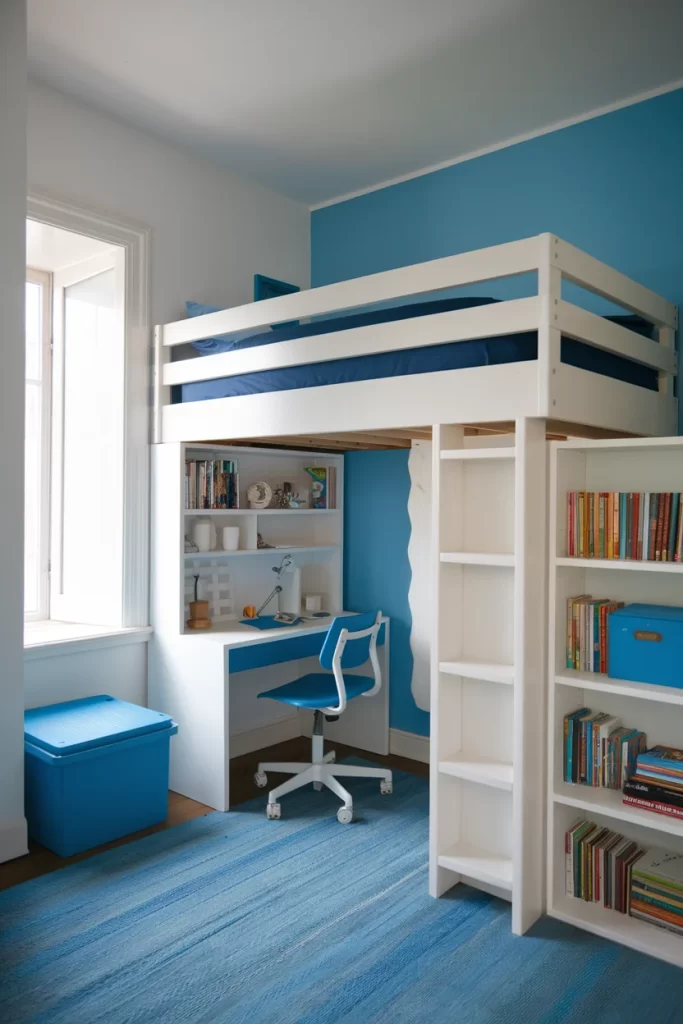 This children’s room showcases a white loft bed with integrated storage and study area underneath. The blue accent wall provides a calming backdrop, while built-in bookshelves and a white desk create a functional workspace. The blue area rug and storage ottoman add comfort and additional color coordination to the room’s clean, organized design.