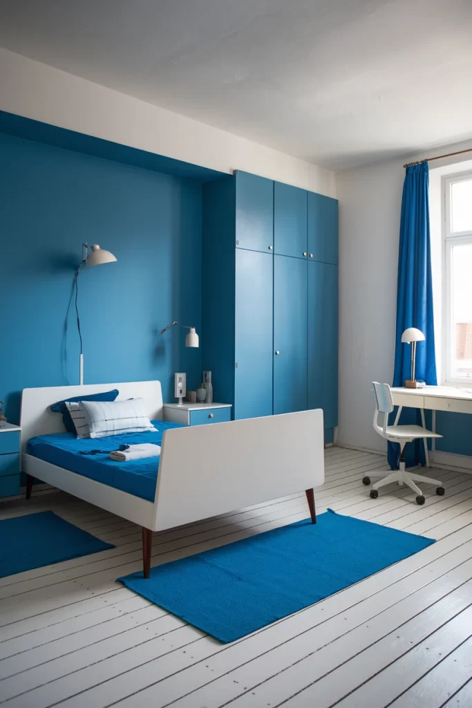 This minimalist bedroom combines white painted wood floors with a blue accent wall and matching blue built-in storage. The white bed frame and blue bedding create a simple yet striking contrast, while blue window treatments tie the color scheme together. The design emphasizes functionality and clean aesthetics.