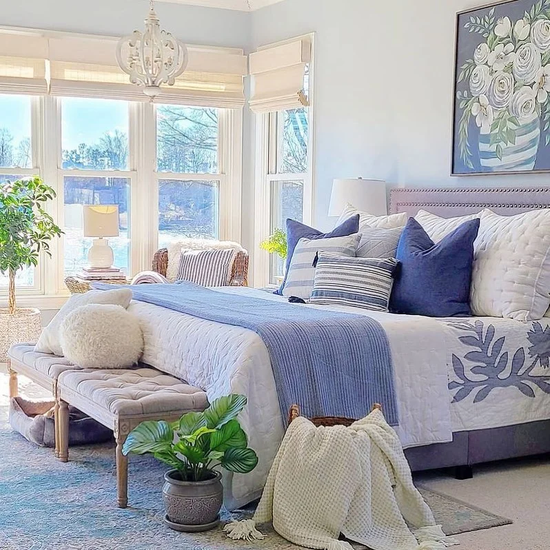 A bright and airy bedroom showcasing soft blue walls and crisp white bedding creates a calming retreat. The upholstered headboard in neutral tones anchors the space, while blue accent pillows and a throw add color coordination. Large windows with natural woven shades flood the room with light, and a comfortable bench at the foot of the bed provides both seating and style. Fresh greenery brings life to this tranquil space.