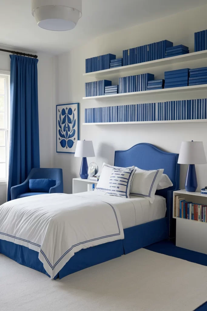 This bedroom creates a library-like atmosphere with extensive blue book collections displayed on white floating shelves. The navy blue upholstered headboard coordinates with matching table lamps and blue window treatments. The white bedding with blue trim maintains the refined color palette while providing visual balance.