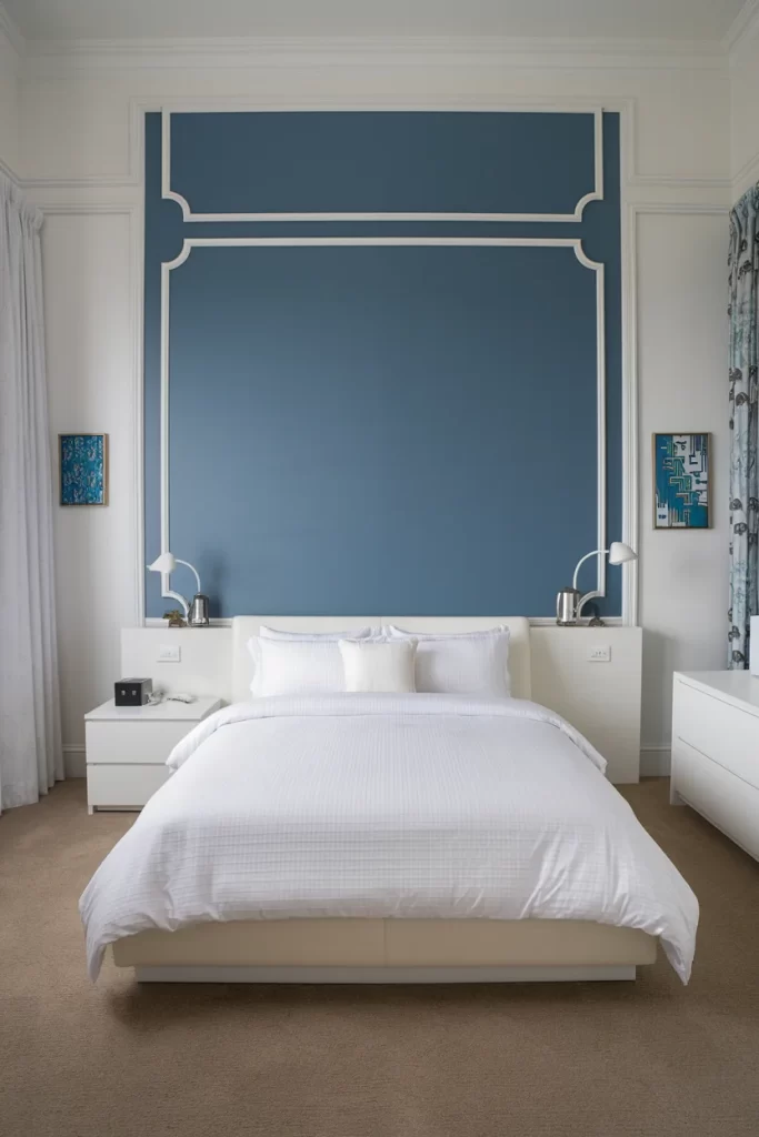This elegant bedroom uses white panel molding against deep blue walls to create sophisticated geometric patterns. The traditional white furniture and brass accents add warmth, while the patterned rug introduces additional visual interest without competing with the wall treatment.