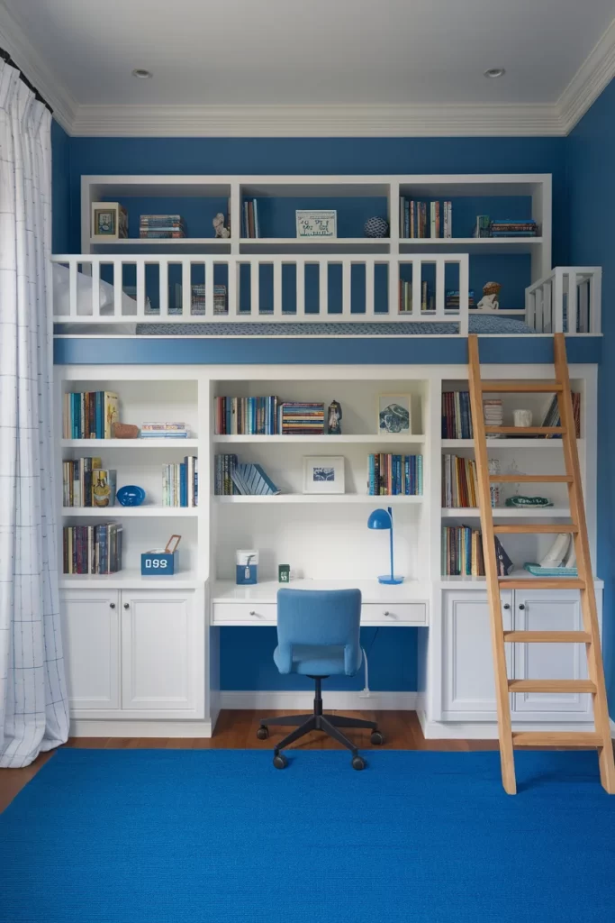 An innovative space-saving design featuring a loft bed above a complete study area with built-in desk and extensive shelving. The blue walls provide a vibrant backdrop for the white built-ins, while the wooden ladder adds natural warmth to the color scheme.