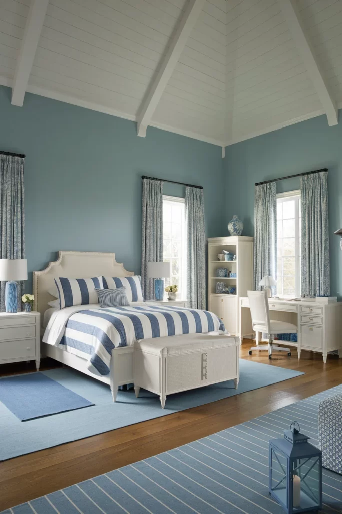 This bedroom features soft blue-gray walls with crisp white exposed ceiling beams creating dramatic architectural interest. The room combines a neutral upholstered bed with navy and white striped bedding, complemented by patterned curtains and a coordinated area rug. The white furniture pieces and built-in shelving maintain visual cohesion while the exposed ceiling adds rustic charm to this sophisticated coastal-inspired space.