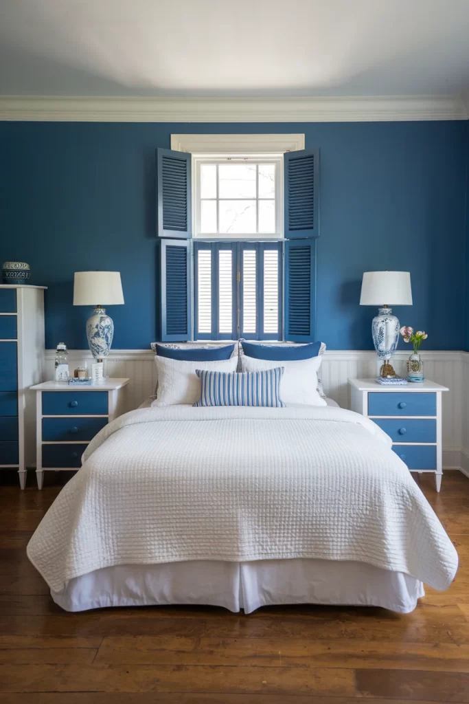 This bedroom demonstrates perfect symmetrical design with matching white nightstands featuring blue drawer fronts flanking the bed. The deep navy walls create a cozy, cocoon-like atmosphere while white wainscoting adds traditional architectural detail. Blue interior shutters frame the window, adding both function and coastal style. The blue and white ceramic table lamps with traditional patterns enhance the nautical theme. The white bedding with blue striped accent pillow keeps the look fresh and crisp.