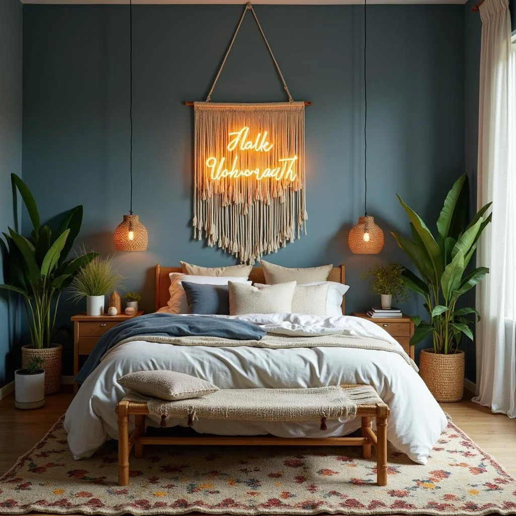 Rich blue walls create dramatic depth while natural textures soften the bold color choice. The macrame wall hanging with neon lettering adds contemporary flair to traditional bohemian elements. Woven pendant lights cast warm, ambient light that enhances the room’s cozy atmosphere. Layer different textiles on your bed to create visual interest and tactile comfort. Large plants in woven baskets bring natural elements indoors while improving air quality. The colorful area rug ties together all the warm earth tones beautifully.