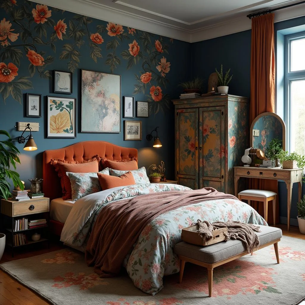 Bold floral wallpaper transforms your dusky blue bedroom into a sophisticated retreat. The deep teal background creates drama while orange blooms add warmth and energy. You can balance this intense pattern with solid colored furniture and crisp white bedding. The trick is letting the wallpaper be the star while keeping other elements simple. Orange pillows and throws echo the floral tones without overwhelming the space. Natural wood furniture grounds the look and prevents it from feeling too feminine. Wall sconces provide focused lighting that highlights the wallpaper’s intricate details. This combination works especially well in rooms with plenty of natural light, where the colors can shift beautifully throughout the day.