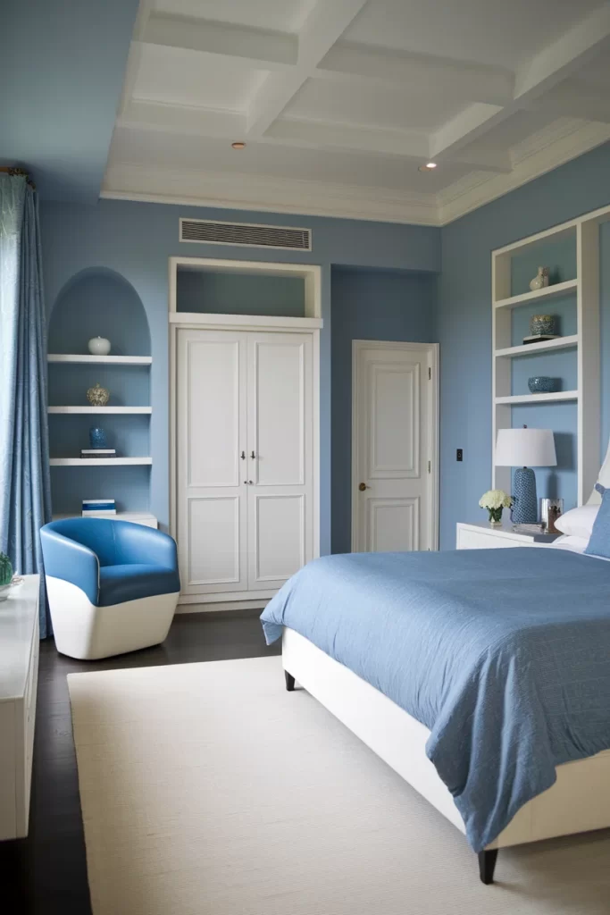 This bedroom maximizes both style and function with built-in white cabinetry and shelving against soft blue walls. The coffered ceiling treatment adds architectural sophistication, while the arched shelving niche provides an elegant display area. A unique two-toned blue and white chair adds visual interest, and the neutral bedding allows the blue walls to be the star of the space.