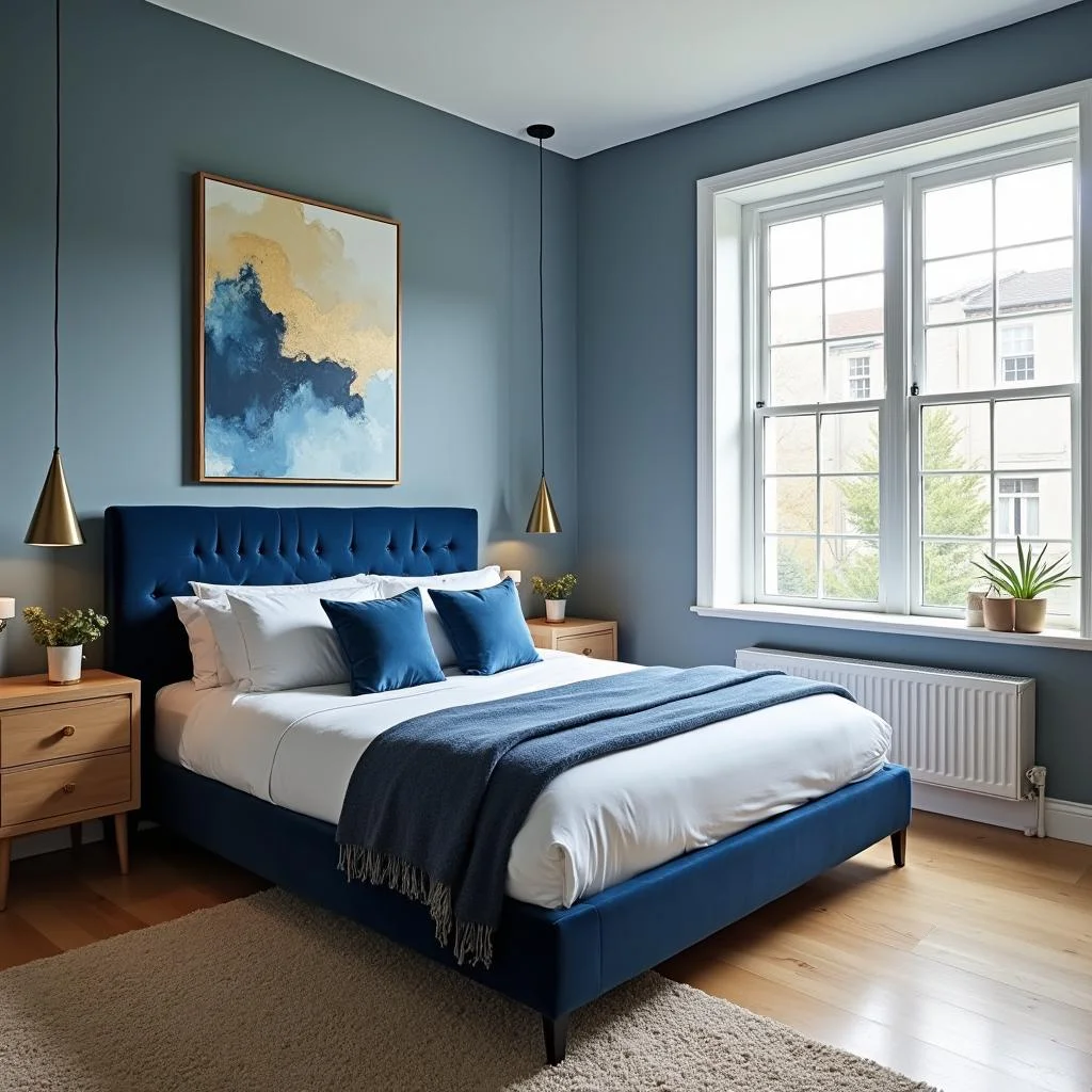 Deep blue walls create intimate atmosphere while gold-framed artwork adds sophisticated contrast. The tufted navy headboard becomes a luxurious focal point that draws the eye upward. Brass pendant lights provide task lighting while adding metallic warmth to the cool blue palette. Choose white linens with blue accents to maintain color harmony throughout your space. Wooden nightstands and flooring add natural warmth that balances the rich blue tones. Small plants on the windowsill bring fresh life to this elegant retreat.