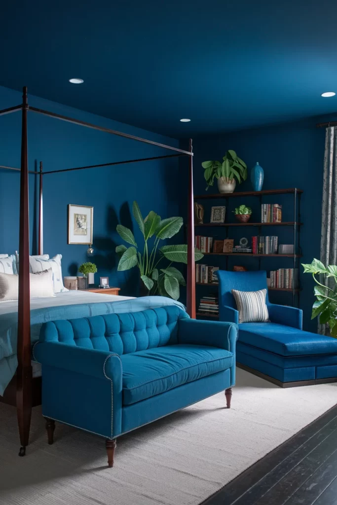 This stunning bedroom showcases deep navy walls that create an enveloping, cocoon-like atmosphere. The dark wooden four-poster bed frame adds architectural drama and sophistication. A vibrant blue tufted loveseat provides both seating and a pop of color contrast, while built-in dark shelving displays books and decorative objects. Large tropical plants bring life to the space, and the layered lighting from recessed fixtures and table lamps creates a warm, inviting ambiance despite the bold dark palette.