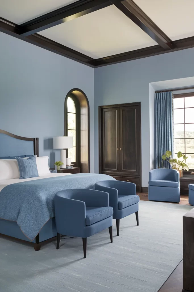 This elegant bedroom uses a softer approach with light blue-gray walls and rich dark wood accents. The coffered ceiling adds architectural interest and luxury, while the arched window detail provides classical charm. Multiple blue seating pieces, including upholstered chairs at the foot of the bed, create a cohesive color story. The neutral bedding and area rug ground the space and prevent color overload.