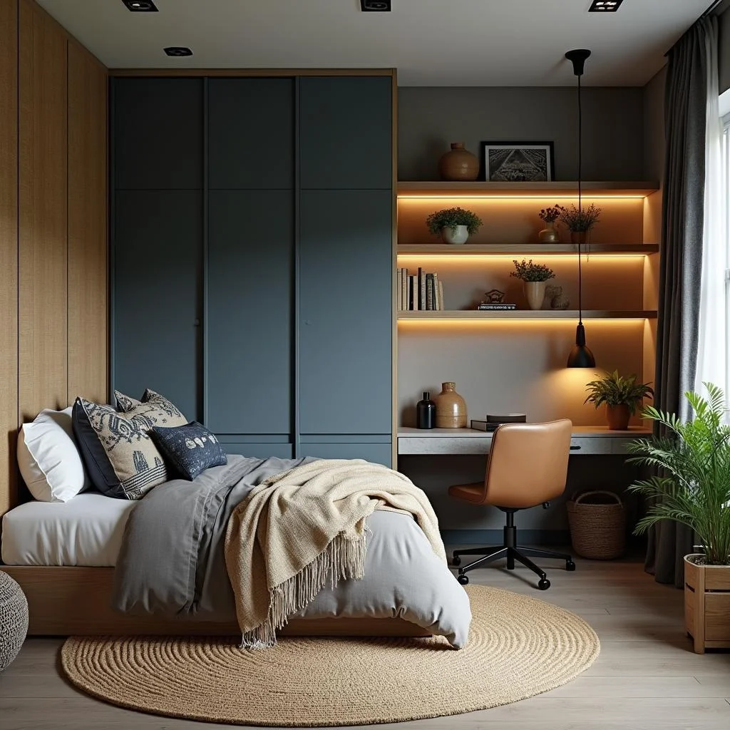 Dark blue cabinetry creates a bold statement wall while maintaining clean, modern lines. The integrated desk area transforms your bedroom into a functional workspace without sacrificing style. Under-shelf lighting illuminates your books and decorative objects, creating visual depth during evening hours. Choose neutral bedding in grays and whites to balance the deep blue tones. The circular jute rug adds organic texture while defining the sleeping zone. Plants throughout the space bring life and natural color that complements the blue palette beautifully.