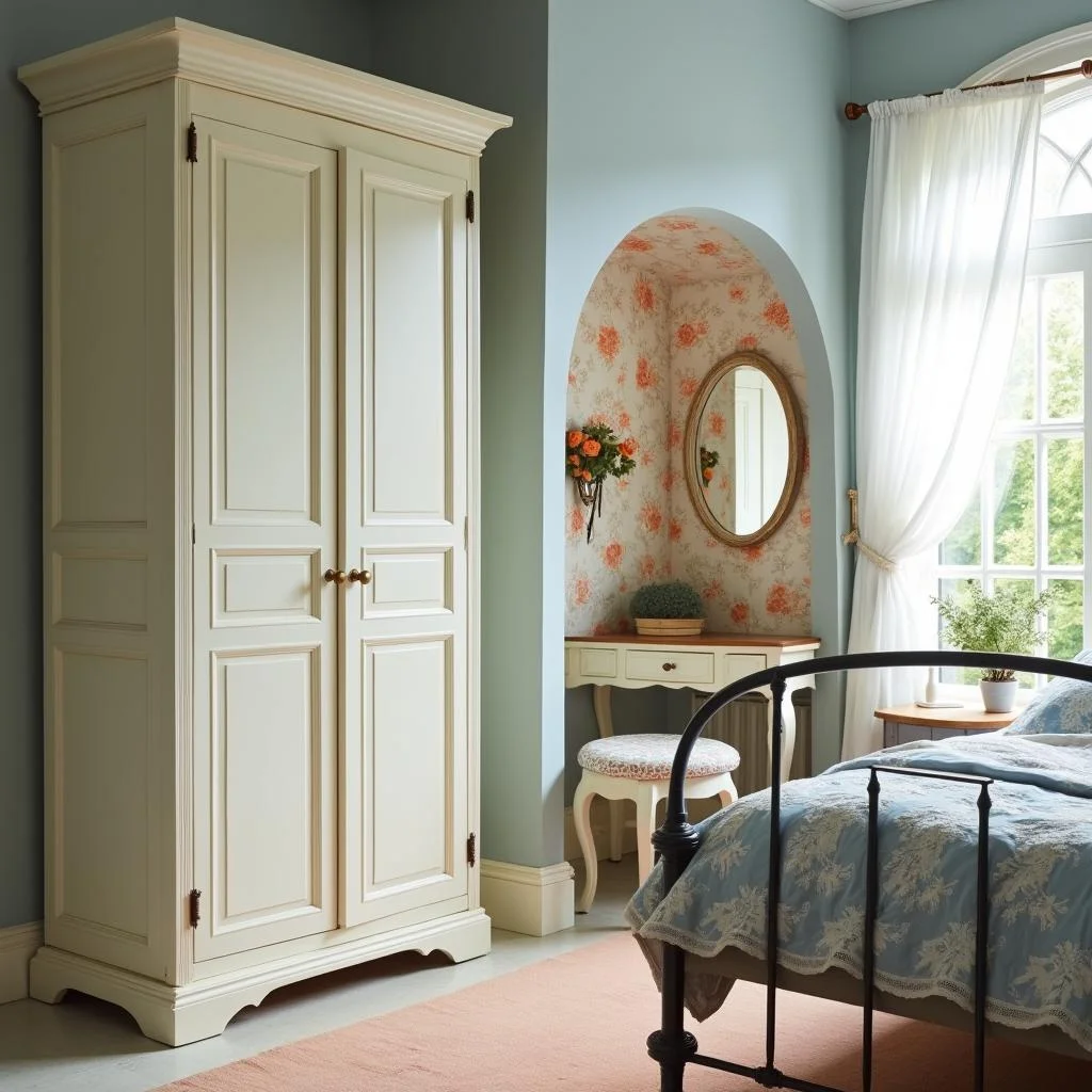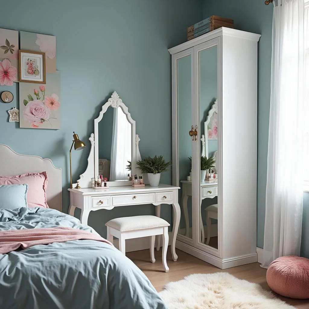 Soft dusky blue walls provide the backdrop for a charming feminine retreat filled with vintage touches. The traditional vanity table with its elegant mirror becomes a focal point for daily beauty routines. White furniture pieces brighten the space while maintaining the cottage aesthetic you love. Floral artwork and pink accents add romantic charm without overwhelming the serene blue foundation. The mirrored wardrobe reflects light around the room, making your space feel larger and more open. Layered textiles in complementary colors create cozy comfort.