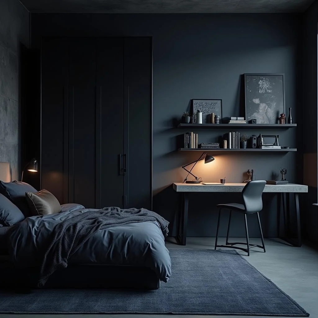 Deep dusky blue creates a dramatic backdrop for a bedroom study area. Built-in shelving provides storage for books and decorative objects. You can create distinct zones for sleeping and working within the same space. Task lighting is crucial in darker color schemes, with multiple sources providing adequate illumination. The moody atmosphere suits those who prefer a more intimate, cocoon-like environment. Modern furniture with clean lines prevents the space from feeling heavy. This approach works well for students or professionals who need a quiet retreat for focused work. The key is balancing the dark walls with strategic lighting and lighter accent pieces.