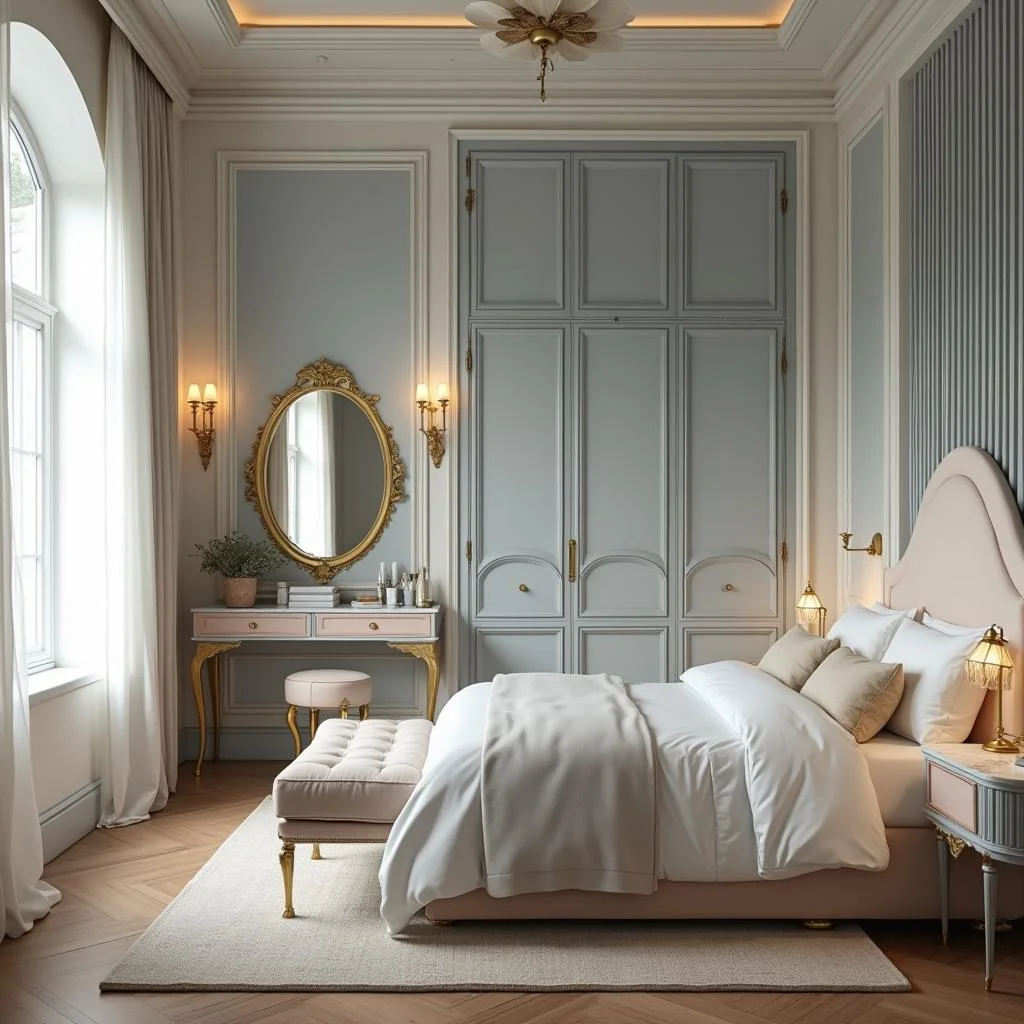 Classic meets contemporary in this sophisticated bedroom where soft blue walls complement ornate golden details. The vintage-inspired vanity table with its curved legs and decorative mirror creates a luxurious dressing area. Built-in wardrobes with traditional paneling provide ample storage while maintaining the room’s elegant aesthetic. Brass wall sconces flanking the ornate mirror add ambient lighting for evening routines. Choose cream and white linens to balance the blue tones and enhance the room’s serene atmosphere. The herringbone wooden floors and neutral area rug ground the space with natural textures.