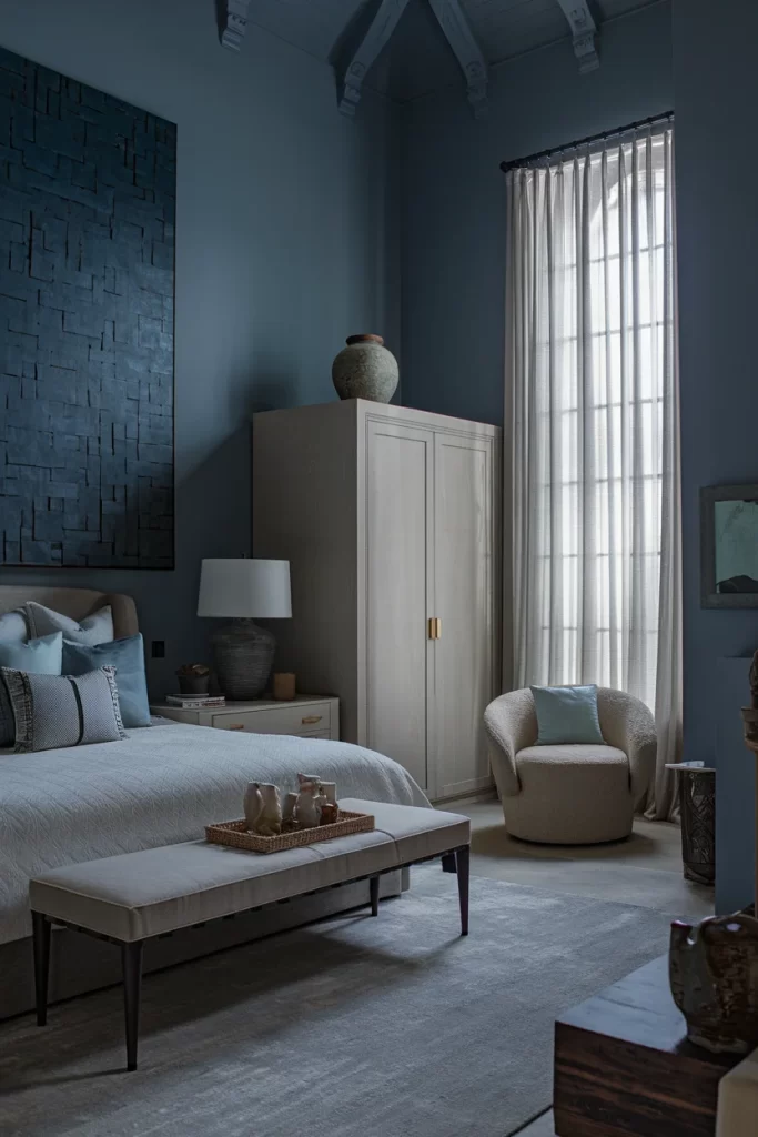 This bedroom demonstrates how different shades of blue can work harmoniously together. The deep blue-gray walls are complemented by a striking geometric textured accent wall that adds visual interest and depth. Neutral furnishings, including a beige upholstered chair and wooden nightstand, provide balance to the intense color scheme. The high vaulted ceiling with exposed beams adds architectural character, while soft natural light filters through sheer curtains.