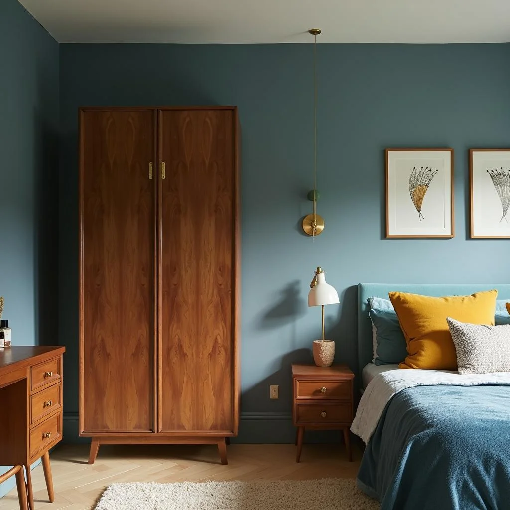 Rich walnut furniture brings warmth to your dusky blue bedroom walls. The combination of cool blue and warm wood creates a balanced, inviting atmosphere. You can achieve this look with vintage pieces or modern furniture inspired by mid-century design. Brass pendant lights add metallic shine and provide task lighting for reading. Mustard yellow accents through pillows and throws create a vibrant contrast against the blue backdrop. The clean lines of mid-century furniture prevent the space from feeling cluttered. Natural elements like plants soften the geometric shapes and add life to the color palette. This style works beautifully in bedrooms with good natural light, where the wood tones can truly shine.