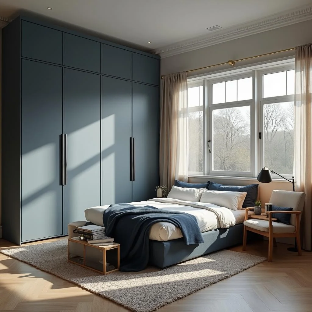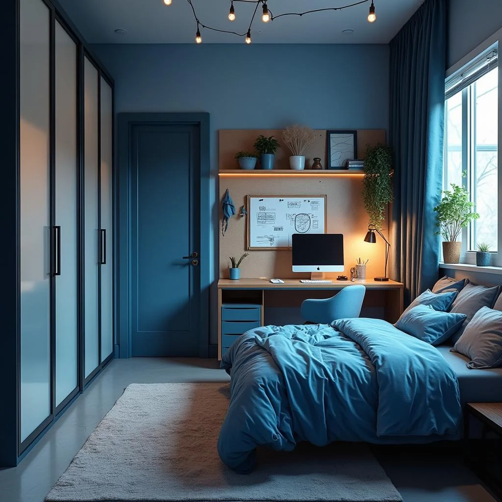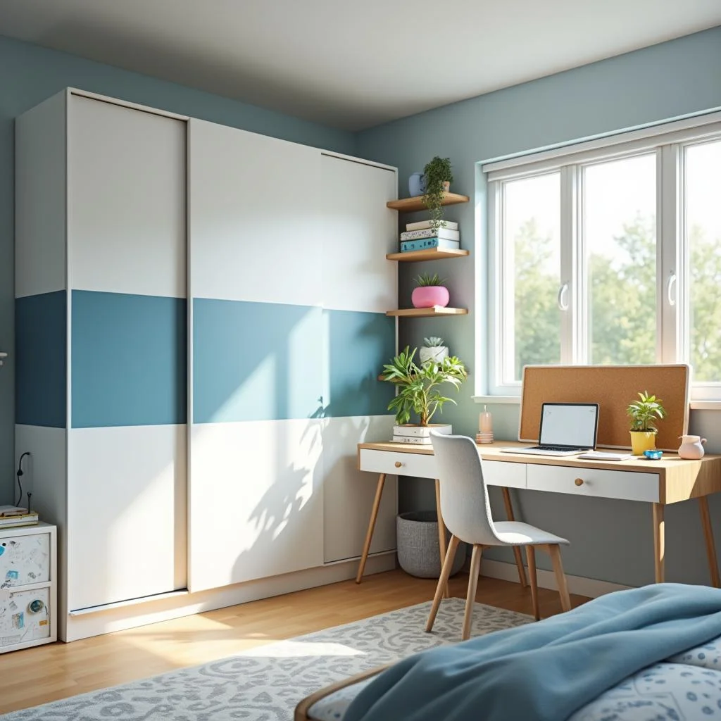 Your bedroom becomes a peaceful retreat when you blend dusky blue with crisp white and warm wood tones. This modern design features sliding wardrobes with blue panels that create visual interest while maximizing storage. The floating corner shelves display plants and books, adding personality without cluttering your space. Natural light streams through large windows, highlighting the calming blue hues that promote restful sleep. Position your desk near the window to take advantage of daylight for work or reading. The geometric rug anchors the sleeping area while wooden flooring adds warmth throughout the room.